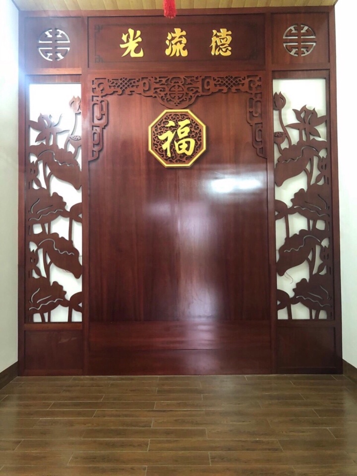 -phòng thờ gỗ được thiết kế trên chất liệu gỗ hương đỏ - vách nghăn có kích thước cao 3m50 x dài 3m -phù hợp với kiến trúc nhà hiện đại